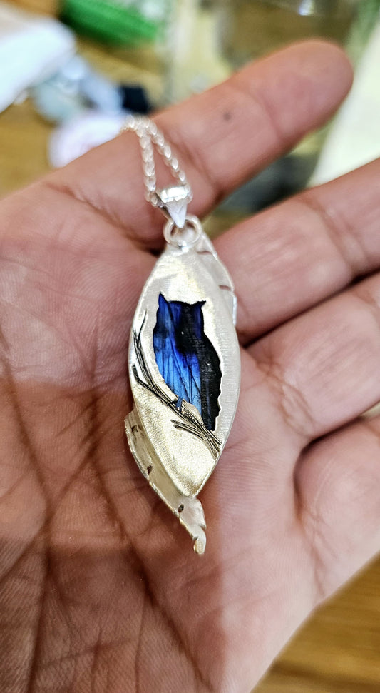 Collier artisanal #0076 en argent 925 avec Labradorite Bleue et Plumes Sculptées