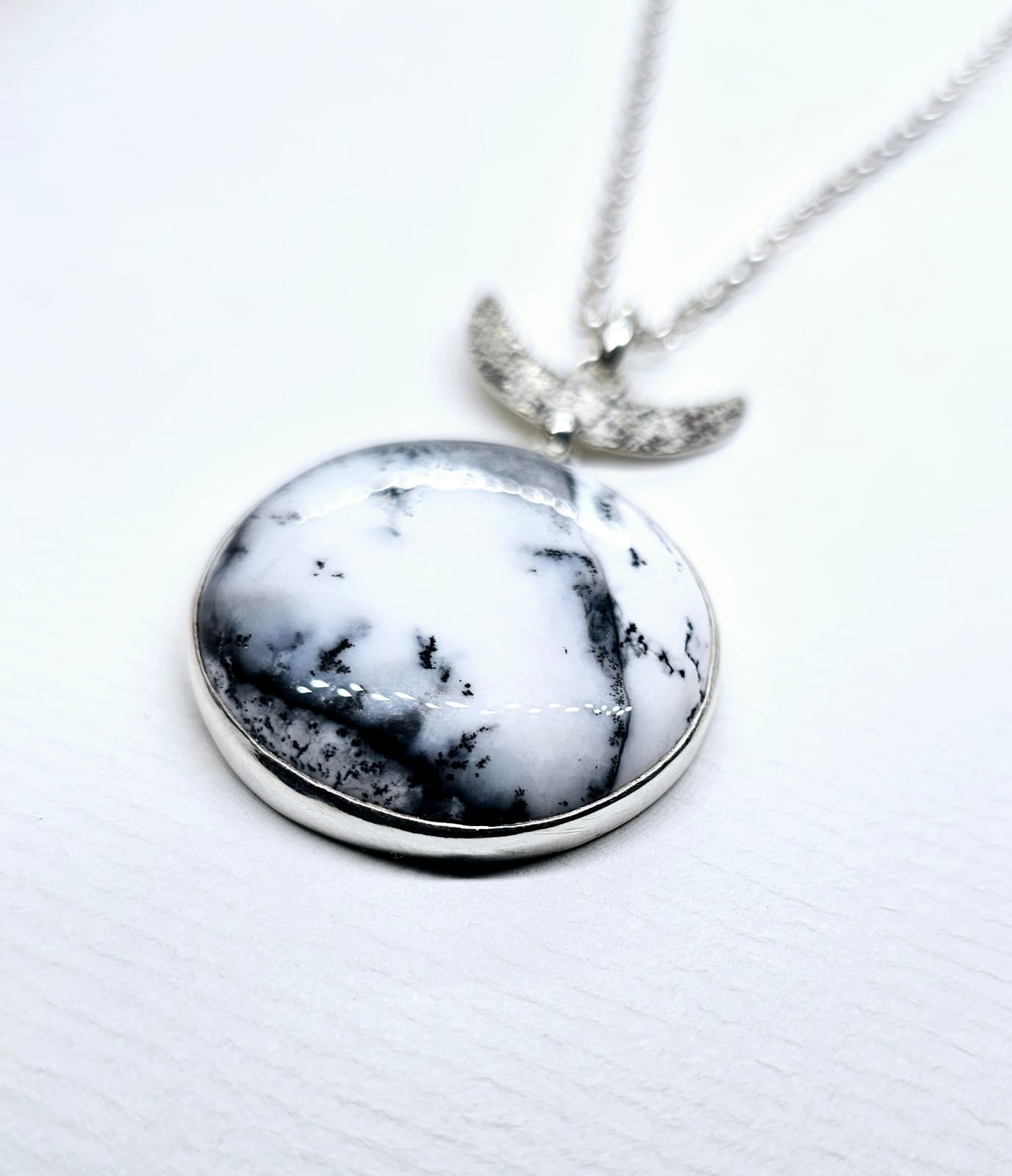 - Une pierre d'Agate Dendritique taillée en cabochon rond, aux tons blancs parsemés de délicates marques noires rappelant des fougères, comme si la nature s’était figée dans sa splendeur.